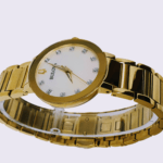Yellow gold-tone stainless steel case and bracelet. Fixed yellow gold-tone bezel. Mother of pearl dial with luminous yellow gold-tone hands and diamond hour markers. Dial Type: Analog. Luminescent hands. Quartz movement. Scratch resistant mineral crystal. Pull / push crown. Solid case back. Round case shape. Case size: 30 mm. Case thickness: 6.9 mm. Band width: 16 mm. Deployment clasp with a push button release. Water resistant at 30 meters / 100 feet. Functions: hour, minute, second. Additional Info: in general, withstands splashes or brief immersion in water, but not suitable for swimming or bathing. Casual watch style. Bulova Mother of Pearl Diamond Dial Laides Watch 97P133.