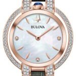 | Rubaiyat – Legendary heritage evoked with a rose gold-tone stainless steel case, synthetic blue spinel cabochon crown at the 12 o?clock position, and 73 diamonds individually hand-set on case parentheses, lugs and white mother-of-pearl dial. Domed sapphire crystal, gray croco-embossed leather strap with pink lining and push-button deployant buckle, iconic dye struck ?Goddess of Time? dimensional case back, and water resistance to 30 meters. Diameter: 35mm Thickness: 8.45mm $1,295 |