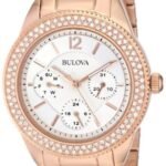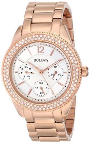 Bulova 97N101 is stylish and attractive ladies Crystal watch is made from PVD rose plated stainless steel with a sparkling stone set bezel and mineral crystal. Inside it is fitted with a reliable Japanese quartz movement. It fastens on a solid rose PVD steel bracelet and has a brushed finish silver dial with rose coloured markers and hands with luminous hand sections. The watch has a day, date and 24 hour function displayed on the three sub dials. Stainless Steel Bracelet Watch is definitely perfect for the sophisticated and modern woman like you.