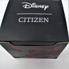 Citizen Eco-Drive Disney Mickey Mouse Men’s Black Leather Band Black Quartz Dial Watch – AP1053-23W. Keep time in playful style with this darling watch from the Citizen Eco-Drive Mickey Mouse Collection. In rose-toned stainless steel this 43.0mm case design features a black dial accented with a Mickey Mouse-shaped moon phase analogue month/day/date display rose-toned hands and markers and a playful Mickey motif along the face. Japanese quartz movement ensures accurate timekeeping and the Citizen Eco-Drive technology harnesses the power of any light source so it never needs a new battery. The black leather strap with red stitching secures with a buckle clasp. Water-resistant to 50 meters.