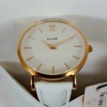 Cluse womens ‘Minuit’ watch with a rose gold casing, white coloured 33mm dial and 2 hand analogue display. White genuine leather strap with a traditional buckle fastening in a leatherette presentation pouch.