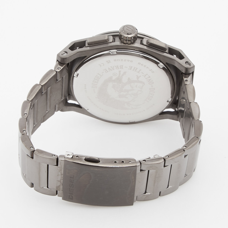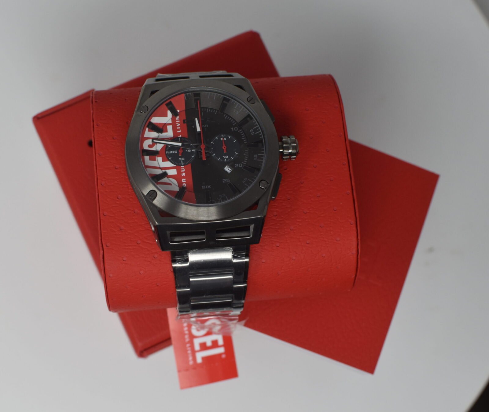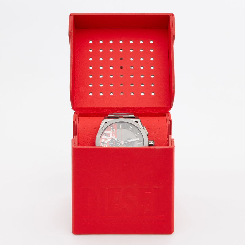 The watch boasts a striking black analogue dial adorned with luminescent hands, making it easy to read in any lighting. The dial also includes a date display and chronograph sub-dials, all protected by durable mineral crystal glass. Powered by a reliable quartz movement, this Diesel watch ensures precision and accuracy.