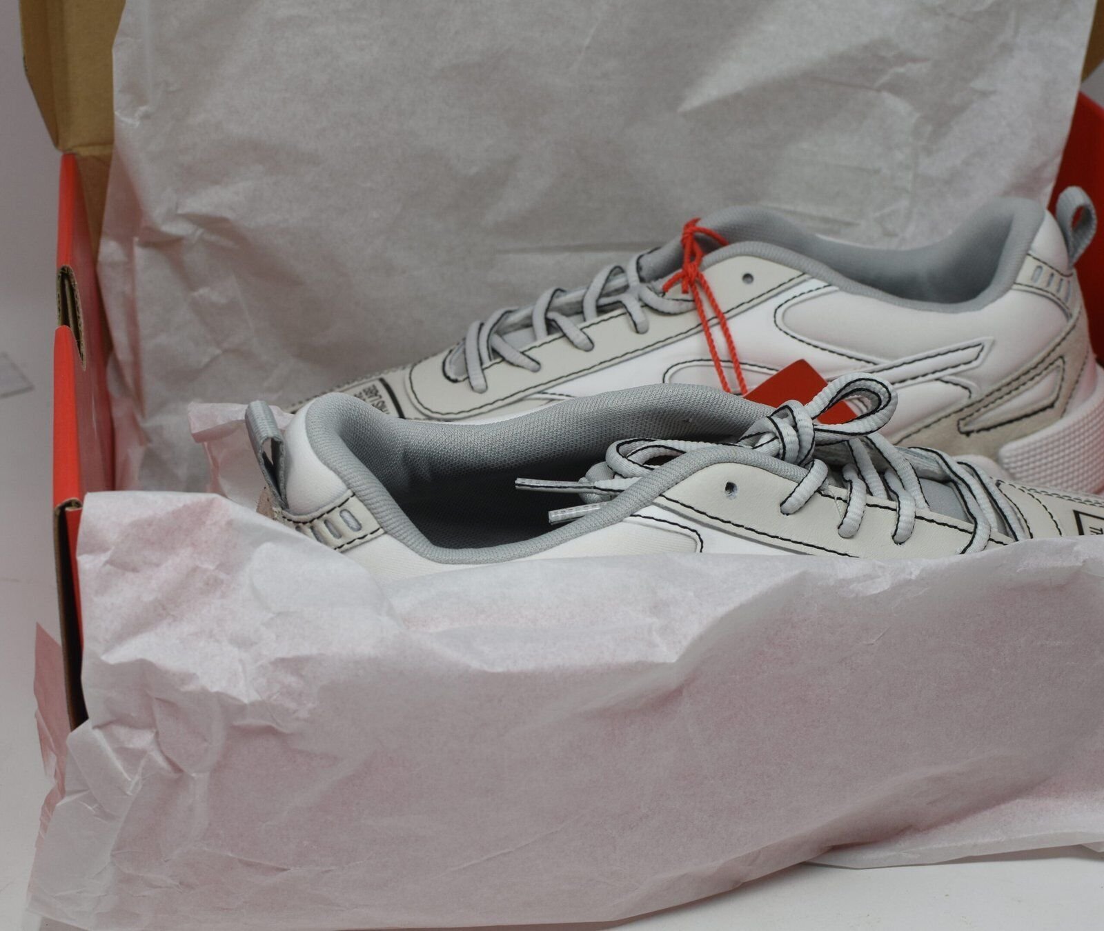 Crafted in white, these sneakers feature a mix of paneled jersey, suede, and buffed leather for a dynamic and textured appearance. The logo and text are tastefully printed throughout, adding a touch of branding without overwhelming the overall aesthetic.