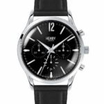 Henry London Edgware 41Mm Leather Strap Wristwatch Featuring A Jet Black Chronograph Dial. The Watch Case Is Stainless Steel And Completed With A Double Domed Acrylic Lens. The Watch Strap Is Made From Soft Black Leather With Cream Lining.This Edgware Model Features The Traditional Hour, Minute And Second Hands And In Addition A Calendar Window At 6 Oclock And Three Sub-Dials For The Chronograph, Each Of Which Performs The Different Functions Of A Traditional Chronograph.