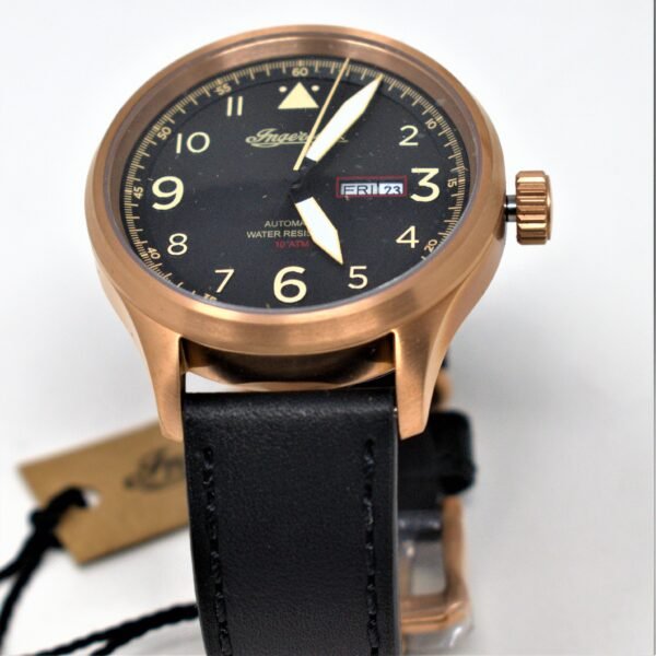 The Mens Ingersoll Watch The Bateman Automatic (The Bateman Automatic I01803) features a black genuine leather strap with pin and buckle strap, a rose gold stainless steel case and has a black with three hand movement and date window at the 3 o’clock marker dial. The The Bateman Automatic I01803 comes with 1 year guarantee.
