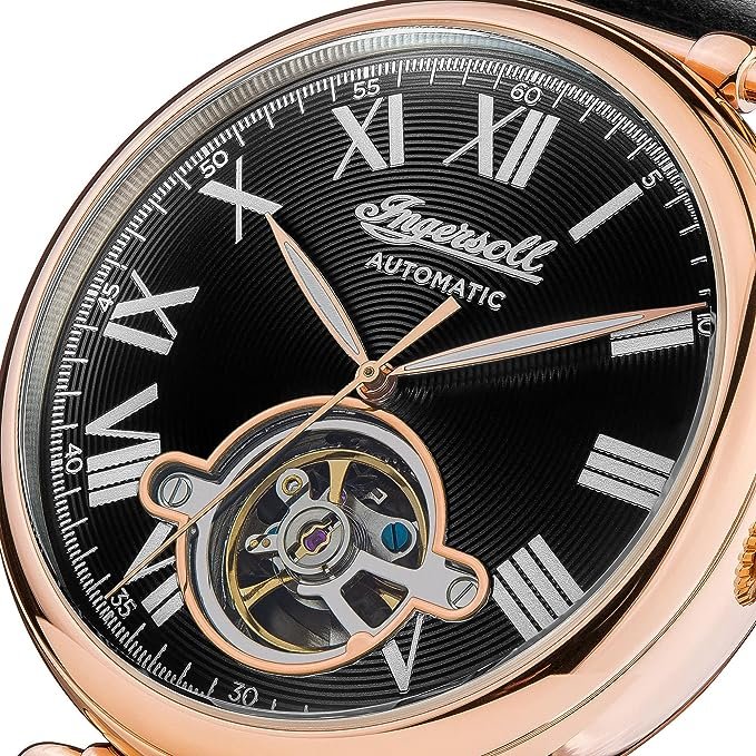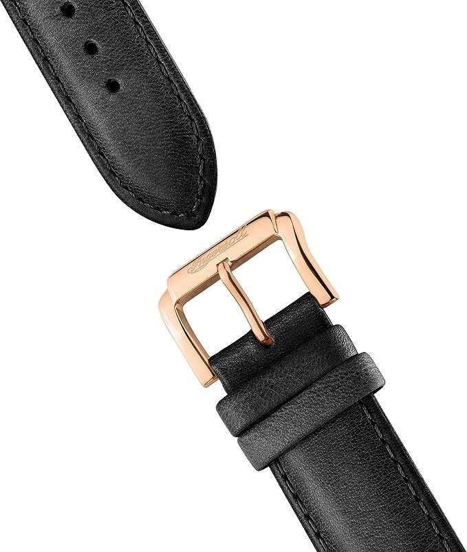 The men’s Ingersoll THE PROTAGONIST AUTOMATIC I08903 is a retro-inspired timepiece with a 46mm case made from rose gold coloured stainless steel, which brings real glamour and depth. Aside from an oversized crown, this is a remarkably simple case that allows the unique dial to shine. A fixed bezel brings sheen and elegance to the Ingersoll THE PROTAGONIST AUTOMATIC I08903.