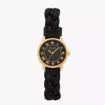 With a case size of 34 mm, this watch features a durable quartz movement that ensures accurate timekeeping. The strap is crafted from black leather, with a comfortable width of 16 mm, and is secured with a single prong strap buckle for a snug fit.