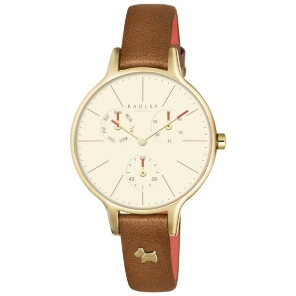 This attractive ladies Radley Wimbledon watch is made from PVD gold plated and is powered by a quartz movement. It is fastened with a brown leather strap and has a salmon dial. The watch also has a date function.