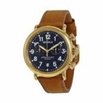 Fusing luxury with functionality, this Shinola Runwell PVD gold plated chronograph men’s watch is both beautifully made and designed to last. Based in Detroit, Shinola showcase all American workmanship, fused with Swiss components for a reliable and powerful watch collection. Fastened with a brown leather strap, this handsome watch features a 41mm PVD gold plated case with a polished bezel. Scratch-resistant sapphire crystal protects the blue dial that protects the deep blue dial, enhanced by bold white Arabic numeral hour markers, Super-LumiNova-filled hands, two chronograph sub dials and a date window at 6 o’clock. Water resistant to 100m, this watch is powered by an argonite 5021 high-accuracy quartz movement, hand assembled from 83 Swiss and other imported components. The rich brown and gold tones of this sleek watch will add a luxurious finish to your look from work to weekend. S0110000175