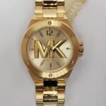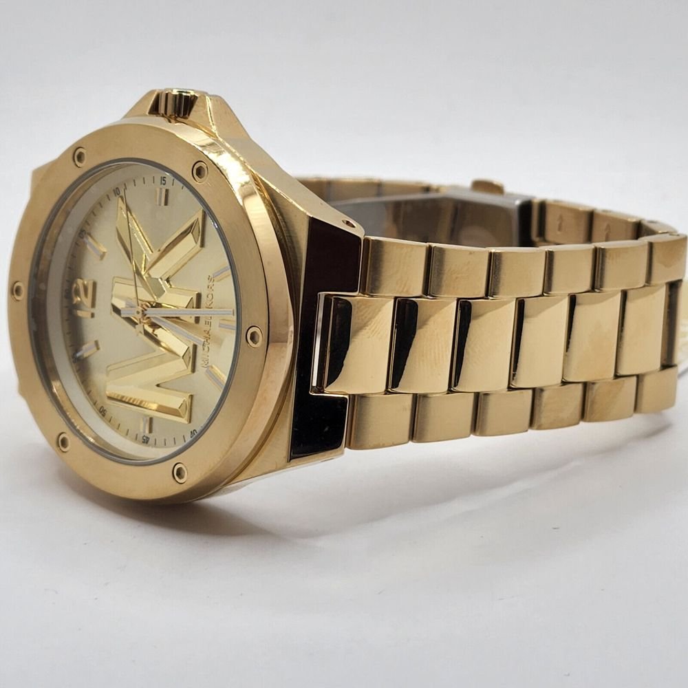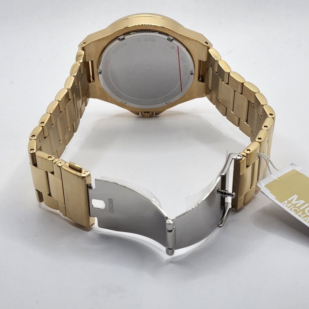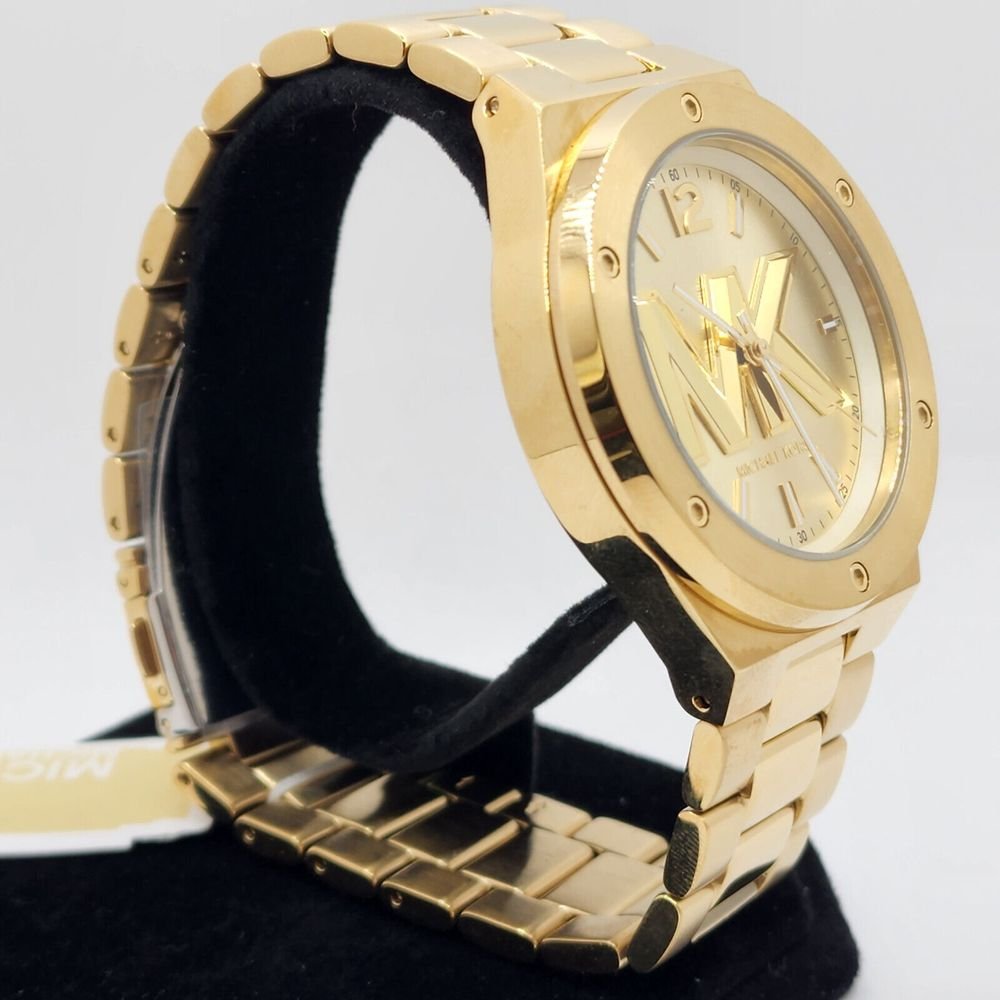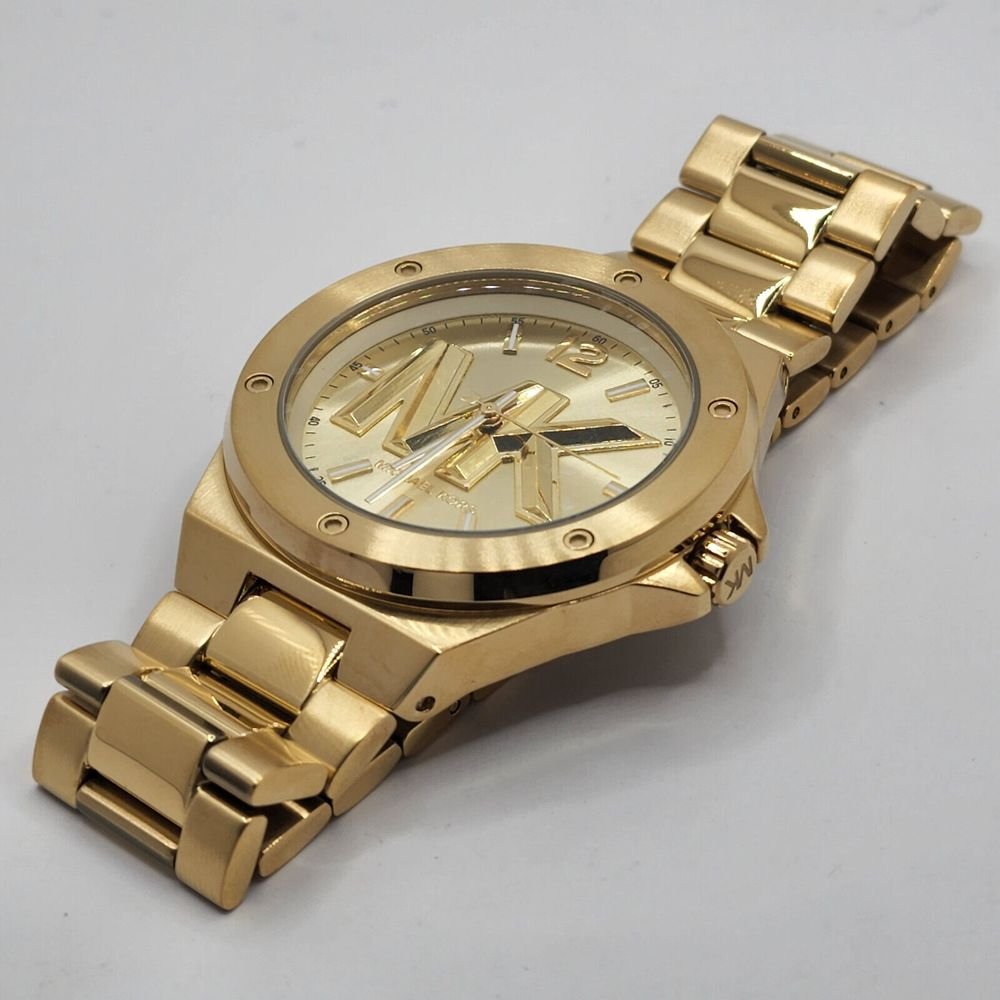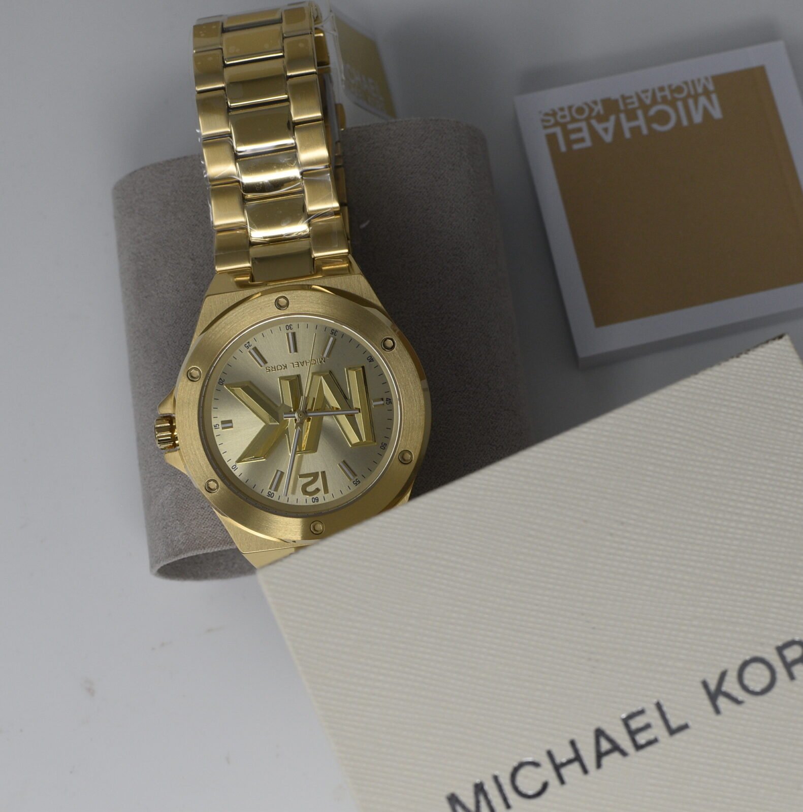 Michael Kors Lennox Gold Logo MK8939 watch combines a 45mm round shaped stainless steel case and gold metal alloy bracelet with a 0. It has a gold analogue dial which is protected beneath mineral crystal glass. Power is generated by the quartz movement. This model also has a water resistance of up to 50 metres.