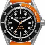 The Michael Kors Maritime Three-Hand Date Orange Silicone Watch seamlessly blends sporty appeal with modern style. Its striking 44mm round black case and fixed black bezel make it an eye-catching accessory for any sport or casual occasion.
