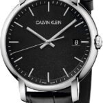Stainless steel case with a black leather strap. Fixed stainless steel bezel. Black dial with luminous silver-tone hands and index hour markers. Minute markers around the outer rim. Dial Type: Analog. Luminescent hands. Date display at the 3 o’clock position. Quartz movement. Scratch resistant mineral crystal. Pull / push crown. Solid case back. Round case shape. Case size: 43 mm. Case thickness: 11 mm. Band width: 20 mm. Tang clasp. Water resistant at 30 meters / 100 feet. Functions: date, hour, minute, second. Casual watch style. Watch label: Swiss Made. Calvin Klein Quartz Black Dial Black Leather Men’s Watch K9H211C1.