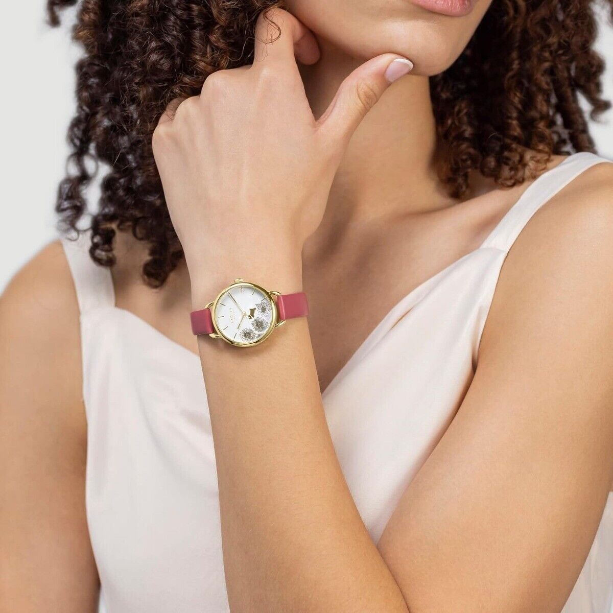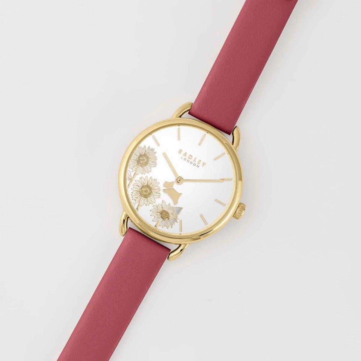 Radley Southwark Park Ladies Watch with Pink Leather Strap RY21622. Radley Southwark Park Ladies Sunflower Copper pink watch. This watch features a copper pink coloured leather strap with a pale gold open shoulder case and sunflower printed jumping dog dial. Includes Radley gift box and 2 year guarantee.