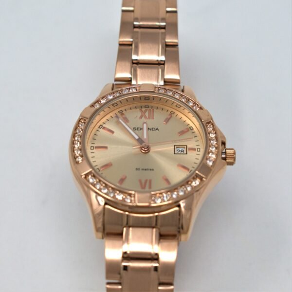 This chic Sekonda ladies’ watch is created in a warm rose gold tone, set to compliment every outfit. A rose runray dial features baton markers, three hands and a date window towards the 3-o-clock mark. Sparkling round crystals adorn the bezel, framing the watch display. A co-ordinating rose gold plated bracelet finishes this timepiece in style. This watch is water resistant up to 50 metres.