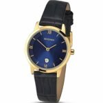 SEKONDA ladies watch. Round gold plated case. Blue dial with roman figures and batons. Date. Blue leather strap. 2 year guarantee.