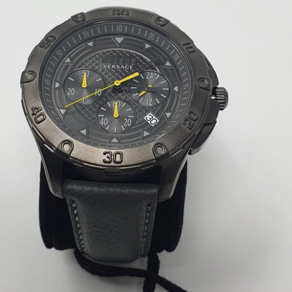 Versus Versace Gents Grey Leather Strap Watch. Grey Dial with Yellow Contrasting Hands to Catch the Eye. This Watch Features Three Sub Dials for Timing and a date Window.
