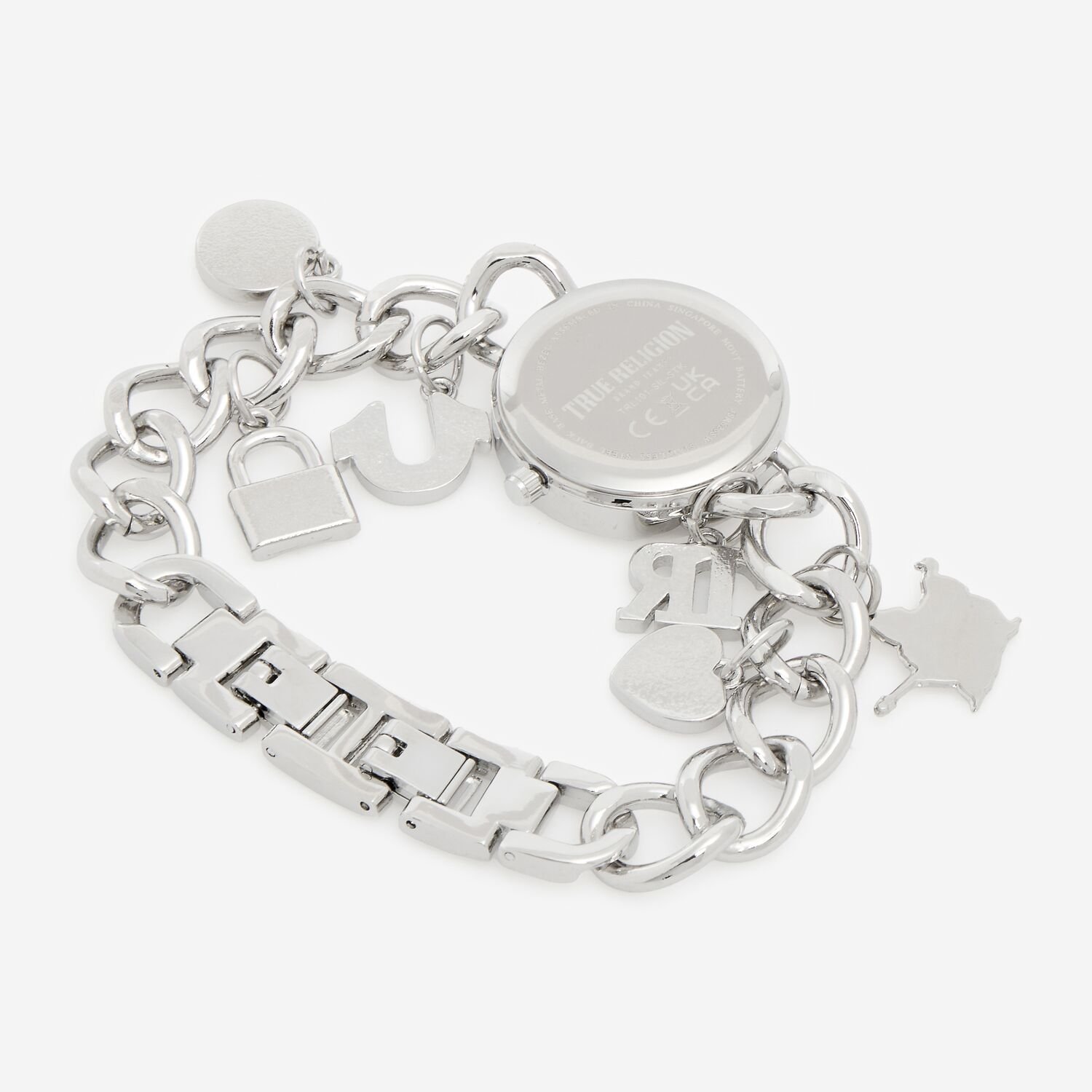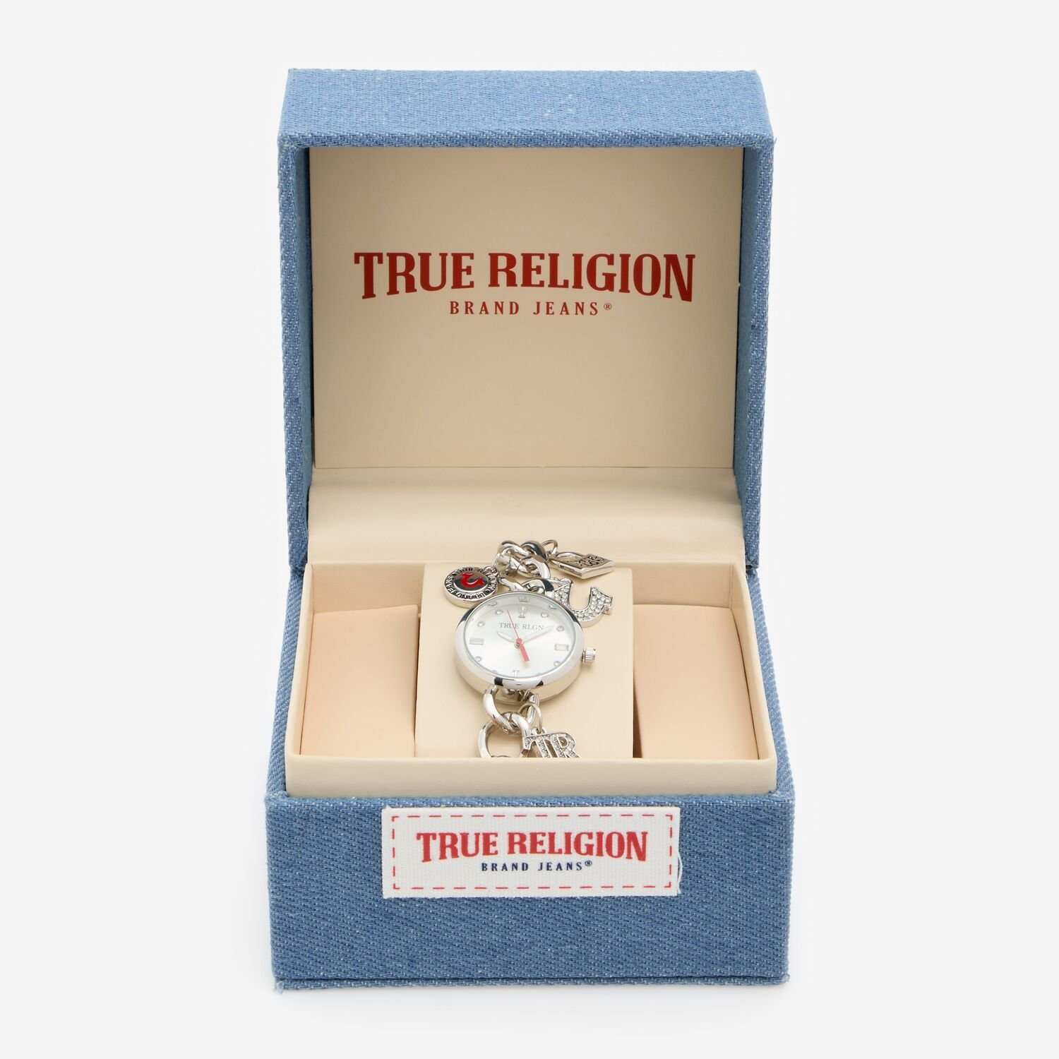 True Religion Silver Rhinestone Charm Bracelet Watch for Women TRL101