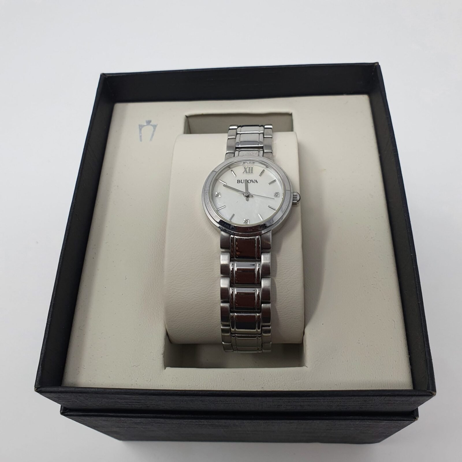 Bulova Women’s Diamond Quartz Watch with Mother of Pearl Dial Analogue Display and Silver Stainless Steel Bracelet 96P165