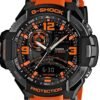Pilot functions inspired this Casio G-Shock Premium Sky Cockpit model, this watch features a digital compass with 20 second history, allowing you to maintain a course or bearing easily. This model also benefits from a neon illuminator back light, that lights the hands and markers out in low light at the touch of a button. The movement is quartz, and also features a thermometer, world time with 48 world cities, 24 hour chronograph with split function, five alarms, date with full auto calendar, and countdown timer. The case is water resistant to 20 atm, and is a stainless steel core, with resin protective pieces, giving the watch incredible shock resistance. The watch fastens on a bright orange rubber strap, and matches the orange highlights on the black dial.