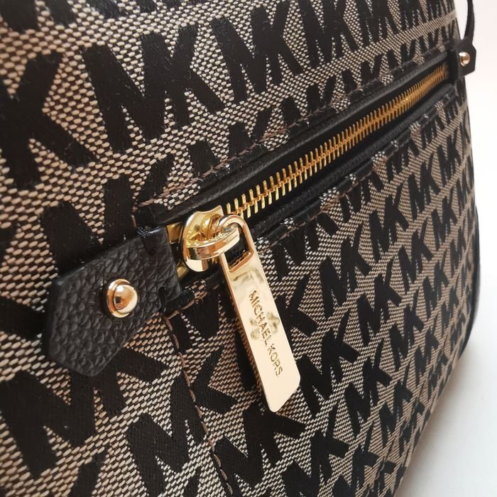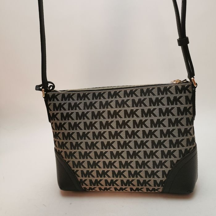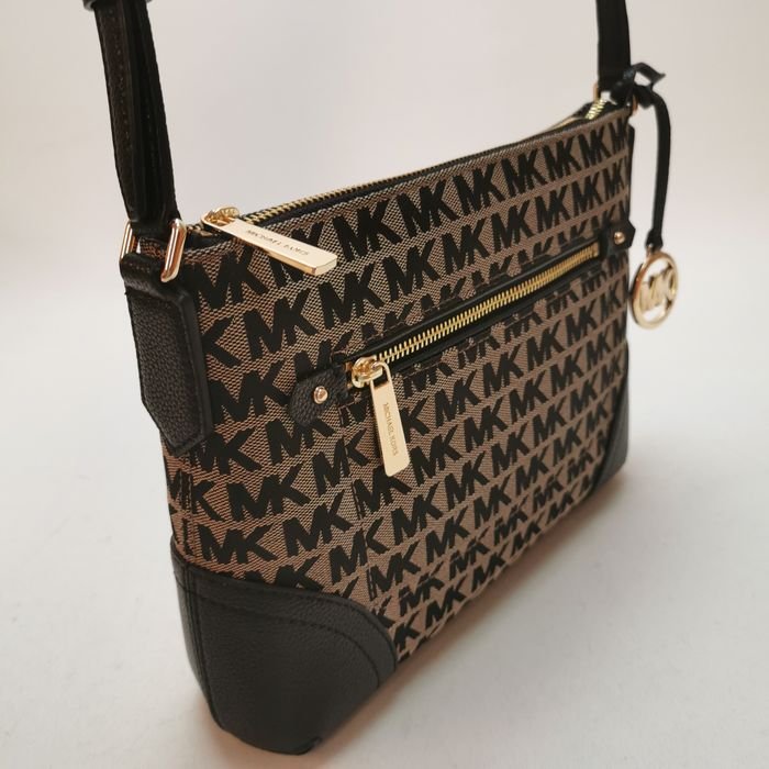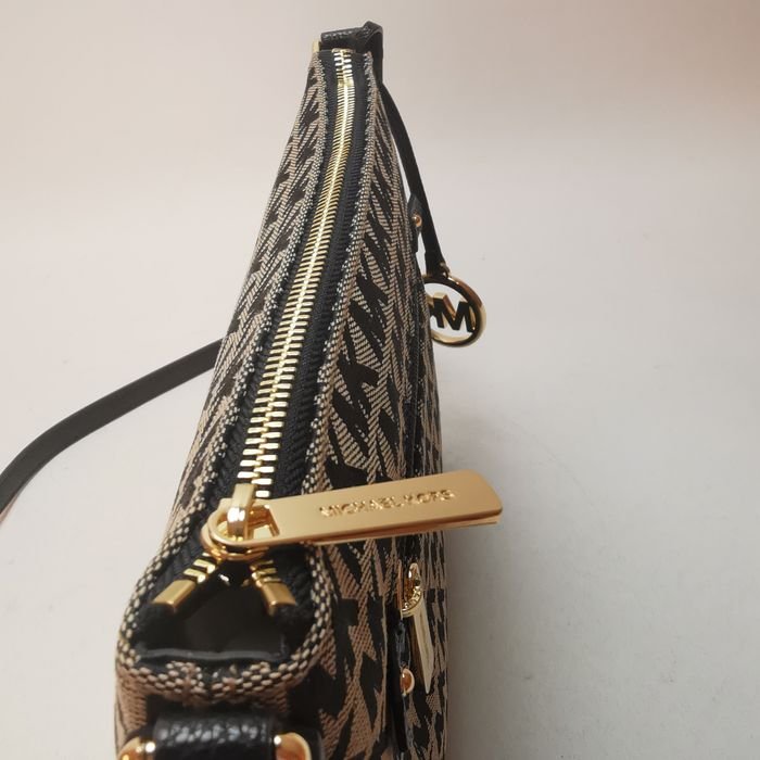 MICHAEL KORS FALLON MK Signature Beige Black Jacquard Messenger Shoulder Bag 38t9xlom2j