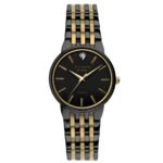 Black and gold – for the matt finish gold tone and polished finish black links of the 18mm, adjustable foldover claps bracelet, and then the 28 x 8mm case with its black dial and gold tone features, plus there’s the sparkle of a diamond at position 12. Water resistant 50m.