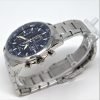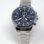 Accurist 7005 mens watch has a round polished stainless steel case and a navy blue colour dial. The dial features chrome finish luminous baton hour markers and yellow hour, minute and seconds hands. A small day date window positioned a 3 o clock and