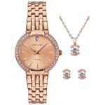 Add timeless sophistication to your jewellery collection with this luxurious Accurist Ladies Rose Gold Diamond & Crystal Watch Earring Necklace Gift Set 8375G