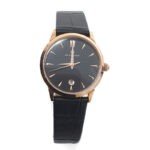 A modern classic, this Accurist women’s timepiece features a rose gold-plated stainless-steel case, striking black dial with rose gold batons, date display and a durable full black leather strap. Splash resistant and includes 1 year guarantee.