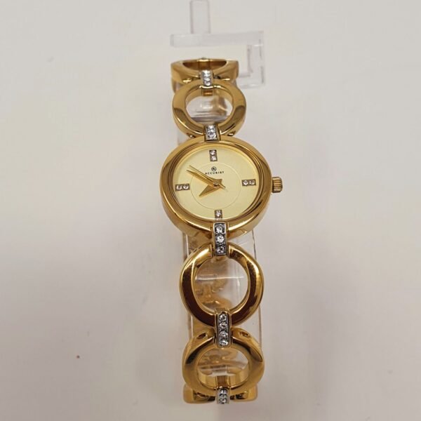 - A Glamorous Accurist women’s timepiece with a round gold plated case, a matching stone set semi bangle bracelet and stunning champagne stone set dial.