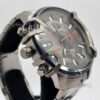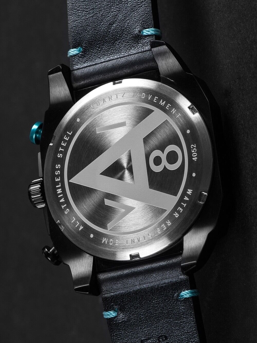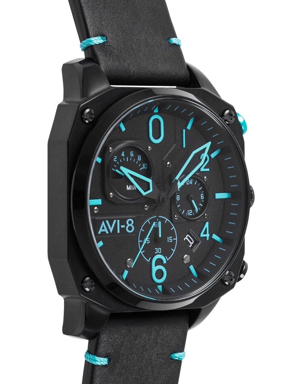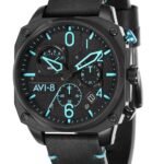 The AVI-8 AV-4052-05 men’s Hawker Hunter watch is slick and functional with its retrograde chronograph stopwatch functionality. Its black dial takes inspiration from the plane’s cockpit with intricate design and blue detailing. Its solid black stainless steel construction is slick and spans 45mm in width. This gents dress watch also features a black genuine leather strap for added style and comfort, fastened together with a black stainless steel tongue buckle.
