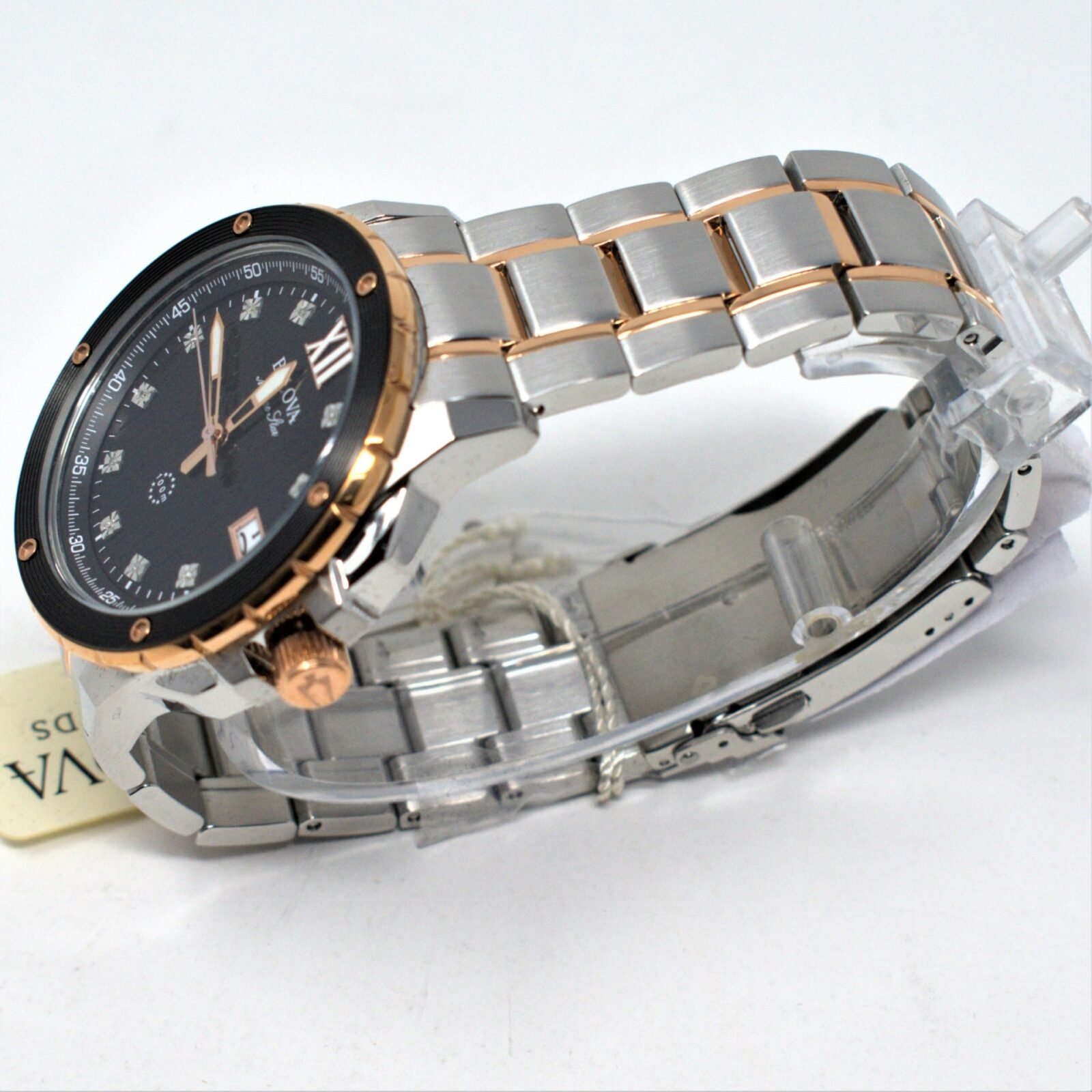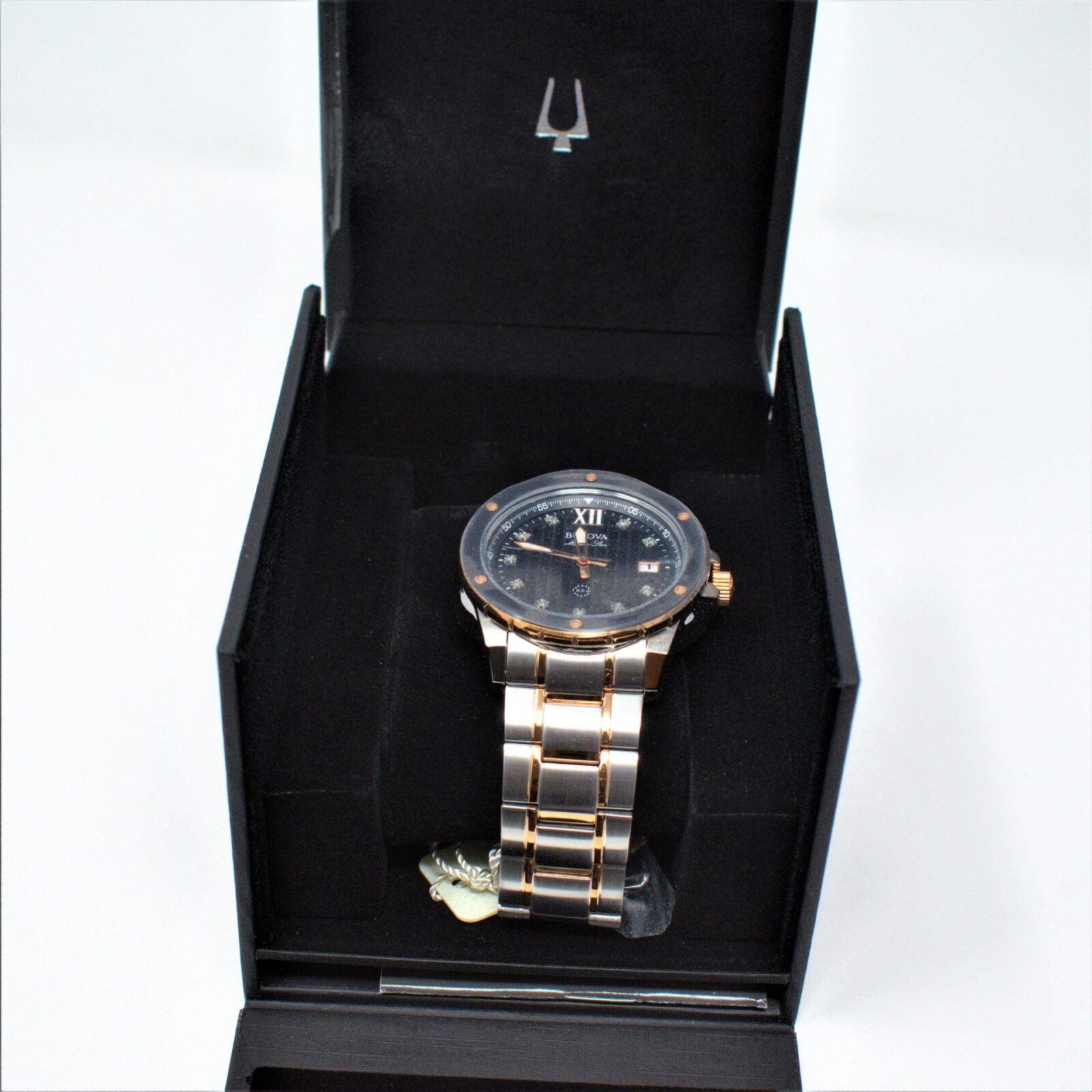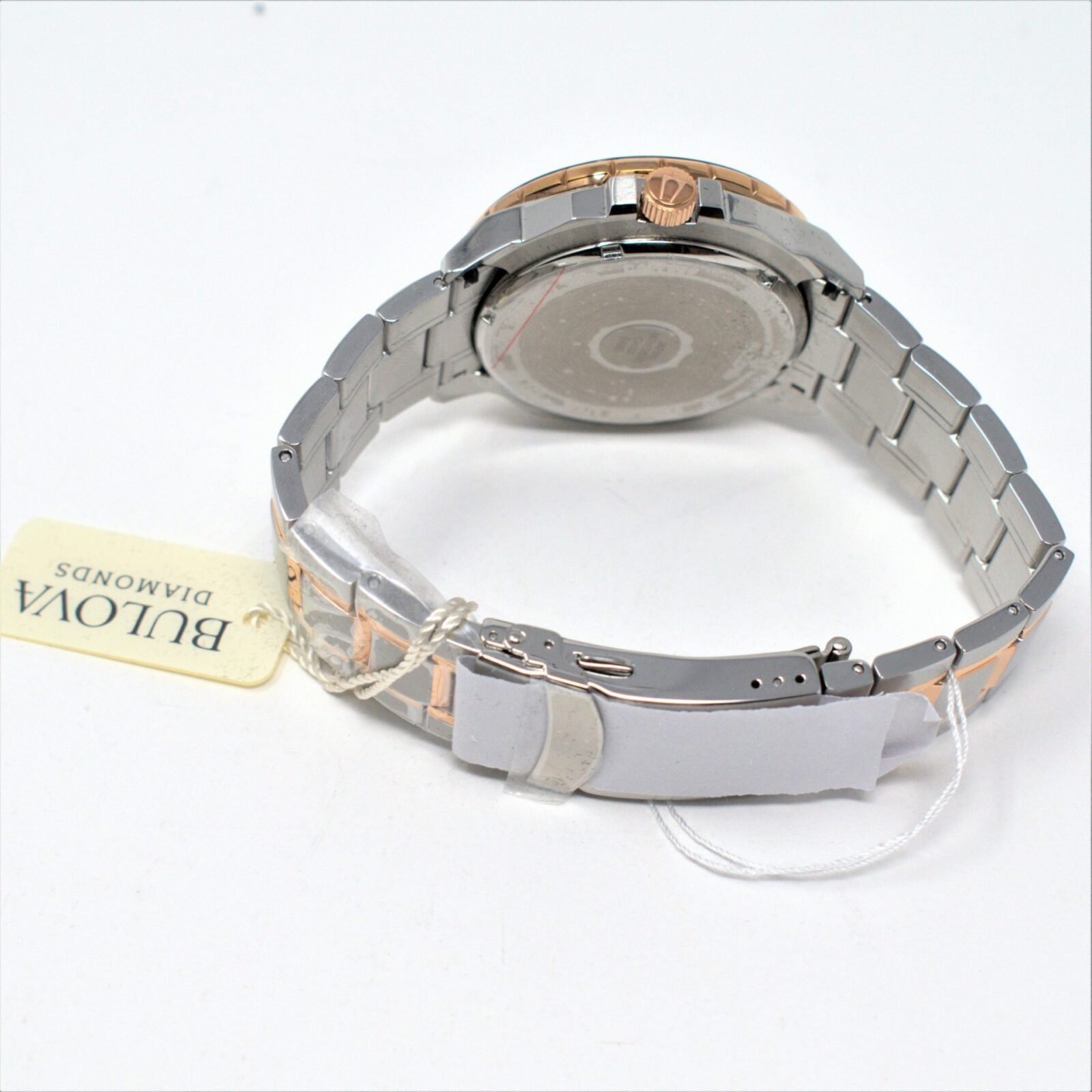 - The dial features three rose gold hands and 10 diamond hour markers.