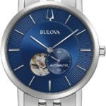 Silver-tone stainless steel case and bracelet. Fixed bezel. Blue dial with silver-tone hands