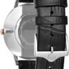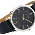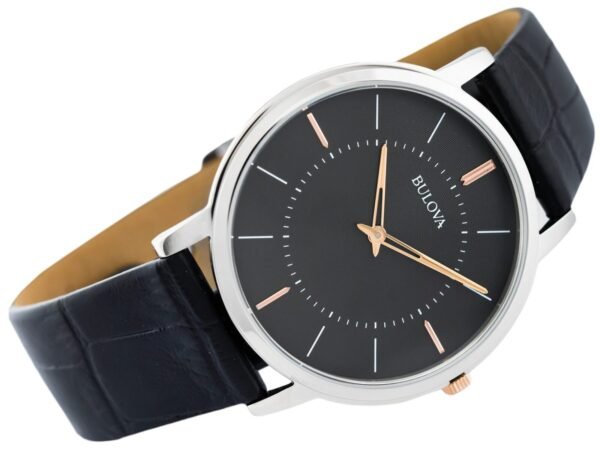 From the Classic Collection. New ultra-slim case in stainless steel and black dial, flat mineral glass, alligator grain black leather strap with three-piece buckle closure.