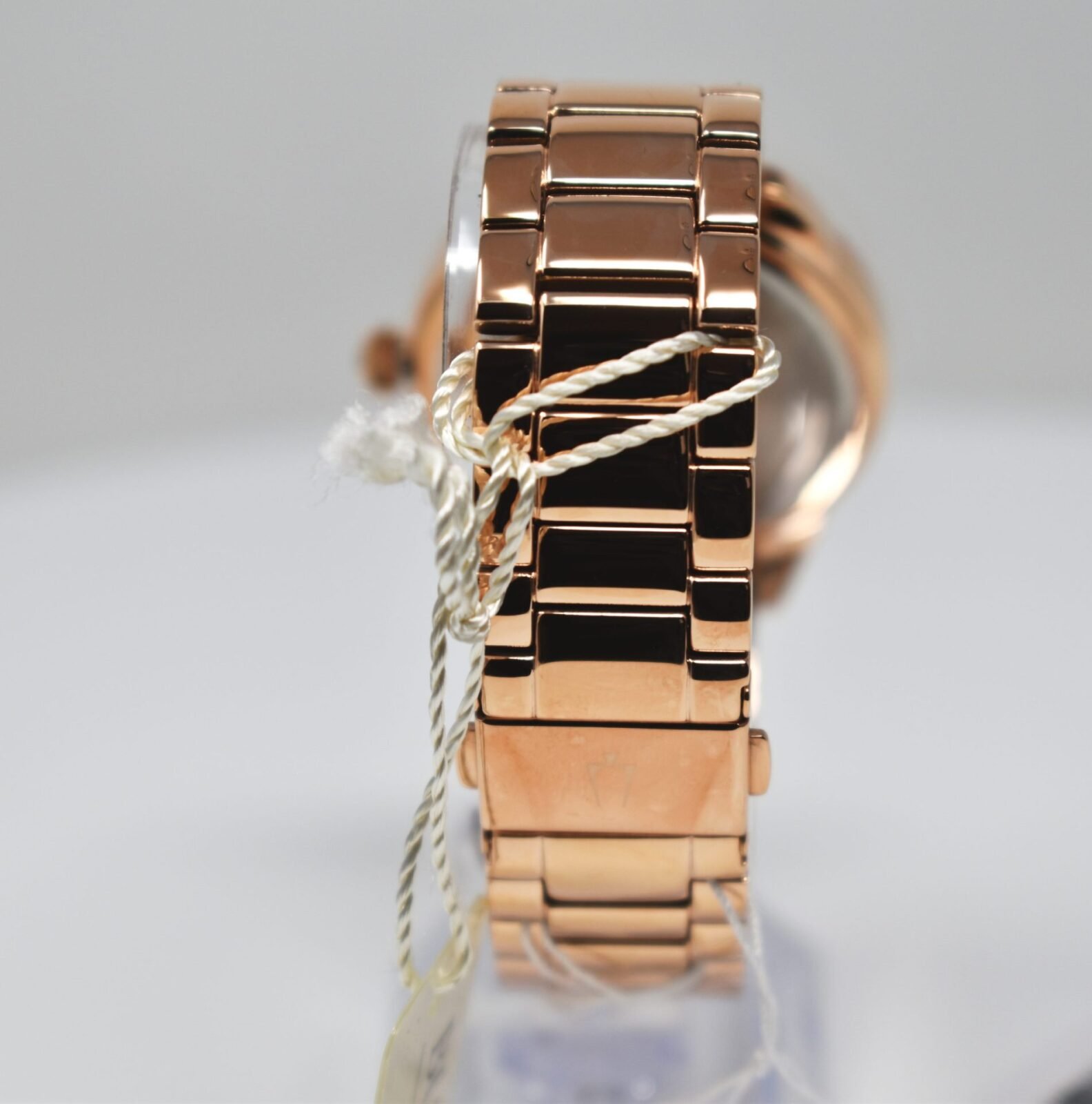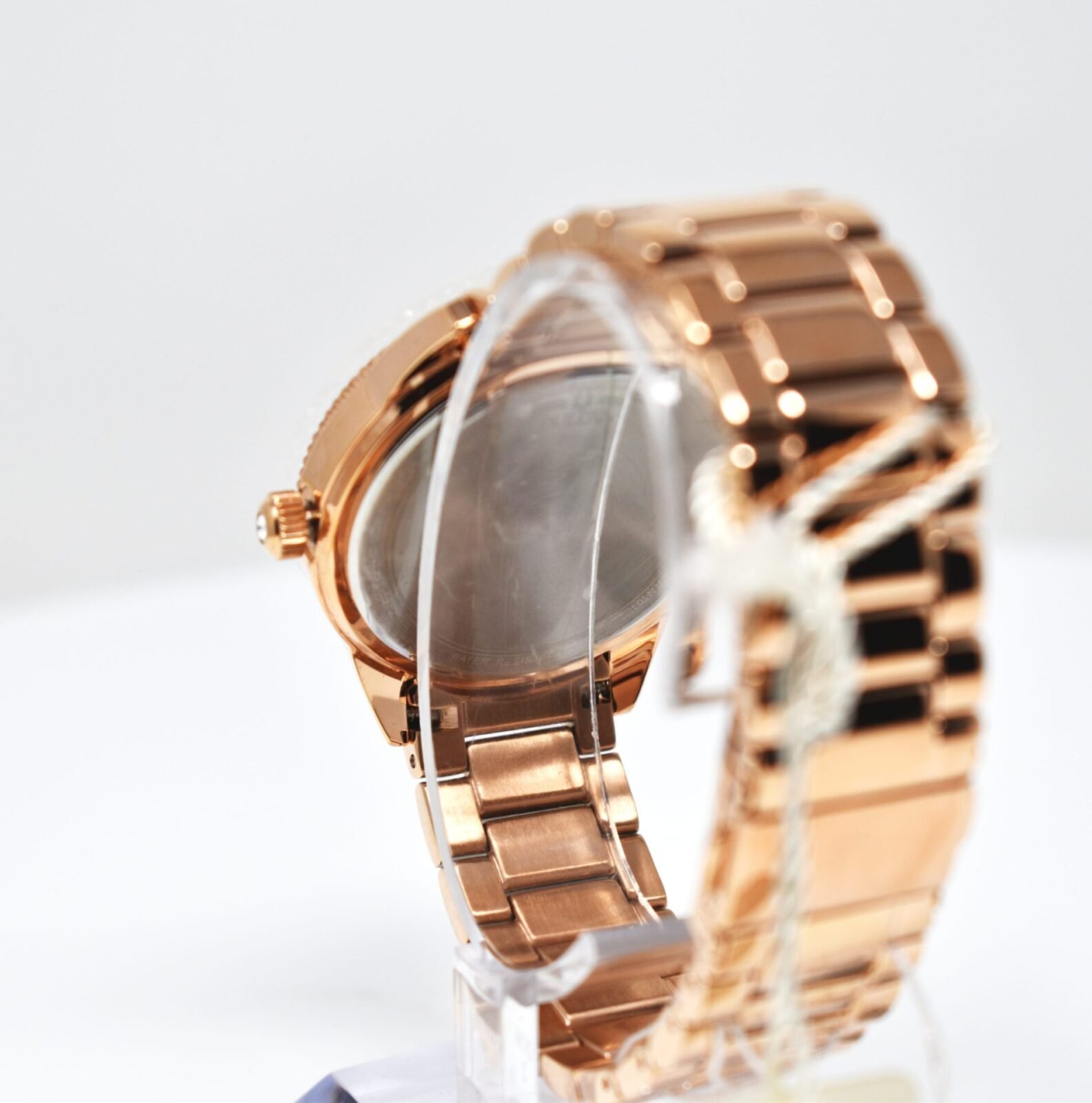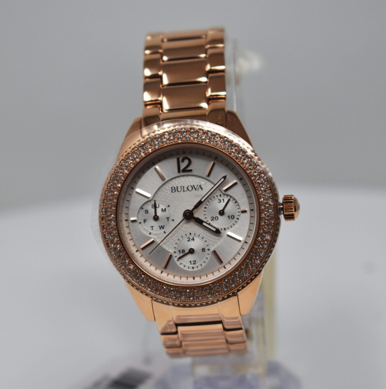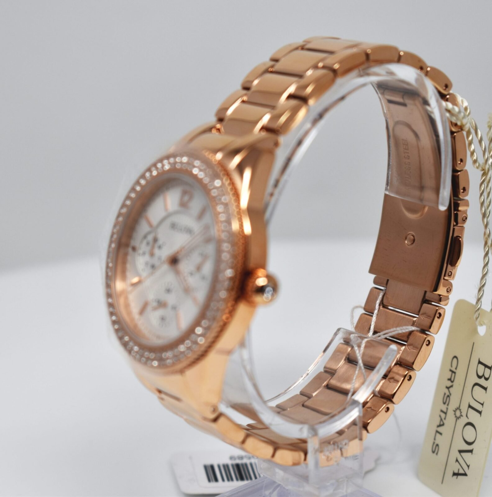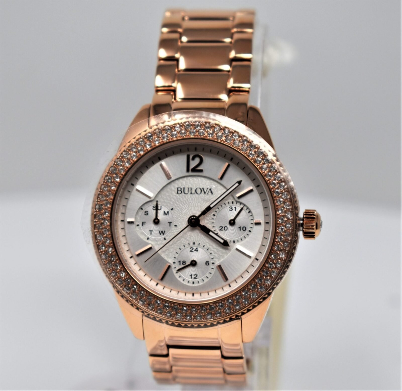 Bulova 97N101 is stylish and attractive ladies Crystal watch is made from PVD rose plated stainless steel with a sparkling stone set bezel and mineral crystal. Inside it is fitted with a reliable Japanese quartz movement. It fastens on a solid rose PVD steel bracelet and has a brushed finish silver dial with rose coloured markers and hands with luminous hand sections. The watch has a day, date and 24 hour function displayed on the three sub dials. Stainless Steel Bracelet Watch is definitely perfect for the sophisticated and modern woman like you.