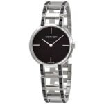 Stainless steel case with a stainless steel bangle bracelet set with black baguette crystals. Fixed stainless steel bezel. Black dial with silver-tone hands. Index markers appear at the 3, 6, 9 and 12 o’clock positions. Dial Type: Analog. Quartz movement. Scratch resistant mineral crystal. Pull / push crown. Solid case back. Round case shape. Case size: 32 mm. Case thickness: 6.25 mm. Band width: 16 mm. Jewelry clasp. Water resistant at 30 meters / 100 feet. Functions: hour, minute. Dress watch style. Watch label: Swiss Made.Calvin Klein Cheers Quartz Black Dial Watch K8NX3UB1