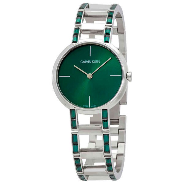 Stainless steel case with a stainless steel bangle bracelet set with green baguette crystals. Fixed stainless steel bezel. Green dial with silver-tone hands. Index markers appear at the 3, 6, 9 and 12 o’clock positions. Dial Type: Analog. Quartz movement. Scratch resistant mineral crystal. Pull / push crown. Solid case back. Round case shape. Case size: 32 mm. Case thickness: 6.25 mm. Band width: 16 mm. Jewelry clasp. Water resistant at 30 meters / 100 feet. Functions: hour, minute. Dress watch style. Watch label: Swiss Made. Calvin Klein Cheers Quartz Green Dial Ladies Watch K8NT3XWL
