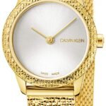 Yellow gold PVD stainless steel case with a yellow gold PVD stainless steel bracelet. Fixed yellow gold PVD bezel. Silver dial with yellow gold-tone hands. No markers. Dial Type: Analog. Quartz movement. Scratch resistant mineral crystal. Pull / push crown. Solid case back. Round case shape. Case size: 24 mm. Toggle clasp. Water resistant at 30 meters / 100 feet. Functions: hour, minute. Casual watch style. Watch label: Swiss Made. Calvin Klein Silver Dial Ladies Watch K3M23V26.