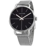 Stainless steel case with a stainless steel mesh bracelet. Fixed stainless steel bezel. Black dial with luminous silver-tone hands and index hour markers. Dial Type: Analog. Luminescent hands. Quartz movement. Scratch resistant mineral crystal. Pull / push crown. Solid case back. Round case shape. Case size: 42 mm. Case thickness: 9 mm. Band width: 18 mm. Fold over slip through clasp. Water resistant at 30 meters / 100 feet. Functions: hour, minute. Even Series. Casual watch style. Watch label: Swiss Made. Calvin Klein Even Quartz Black Dial Ladies Watch K7B21121.