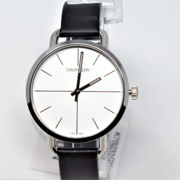 The Calvin Klein Even watch, reference number K7B231CY, comes with a stainless steel case that measures 36 mm in diameter. The case is presented on a black leather strap fitted with a tang buckle. This model is equipped with the ETA F05.401 quartz movement and on the silver dial indicates hours and minutes. The watch is water-resistant to 30 meters. This timepiece is offered in an unworn condition and includes the manufacturer’s box and papers.