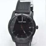 Black PVD stainless steel case with a black rubber strap. Fixed black PVD bezel. Black dial with luminous grey hands and index hour markers. Minute markers around the outer rim. Dial Type: Analog. Date display at the 3 o’clock position. Quartz movement. Scratch resistant mineral crystal. Pull / push crown. Solid case back. Round case shape. Case size: 42 mm. Case thickness: 9.17 mm. Band width: 22 mm. Tang clasp. Water resistant at 30 meters / 100 feet. Functions: date, hour, minute, second. Casual watch style. Calvin Klein Evidence Quartz Black Dial Men’s Watch K8R114D1.