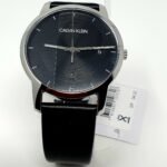 Stainless steel case with a black leather strap. Fixed stainless steel bezel. Black dial with luminous silver-tone hands and index hour markers. Dial Type: Analog. Luminescent hands. Date display at the 3 o’clock position. Quartz movement. Scratch resistant mineral crystal. Pull / push crown. Solid case back. Round case shape. Case size: 43 mm. Case thickness: 9 mm. Band width: 22 mm. Tang clasp. Water resistant at 30 meters / 100 feet. Functions: date, hour, minute, second. Casual watch style. Watch label: Swiss Made. Calvin Klein City Quartz Black Dial Mens Watch K2G2G1C1.