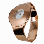 Rose gold-tone stainless steel case and bangle bracelet. Fixed rose gold-tone bezel. Silver dial with rose gold-tone hands. No markers. Dial Type: Analog. Quartz movement. Scratch resistant mineral crystal. Pull / push crown. Solid case back. Round case shape. Case size: 38 mm. Case thickness: 10 mm. Band width: 15 mm. Jewelry clasp. Water resistant at 30 meters / 100 feet. Functions: hour, minute. Dress watch style. Watch label: Swiss Made. Calvin Klein Seamless Silver Dial Medium Bangle Ladies Watch K8C2M616.