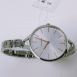Stainless steel case with a stainless steel bracelet. Fixed stainless steel bezel. Silver dial with rose gold-tone hands and index hour markers. Dial Type: Analog. Quartz movement. Scratch resistant mineral crystal. Pull / push crown. Solid case back. Round case shape. Case size: 36 mm. Case thickness: 7 mm. Fold over clasp. Water resistant at 30 meters / 100 feet. Functions: hour, minute. Dress watch style. Watch label: Swiss Made. Calvin Klein Graphic Silver Dial Ladies Watch K7E23B46.