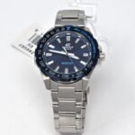 The cool-blue colour scheme contrasts beautifully with the stylish stainless-steel bracelet of the Gents Casio Edifice Watch. The dark-blue bezel houses the mid-blue dial, which has chunky silver hour baton markers, and outsized luminous hands along with a blue second hand and subtle minute indicators. Combining a sporty vibe with smart styling, this is a versatile timepiece that’ll quickly become a firm favourite.