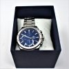 Attractive screw detailing on the bezel gives this Edifice watch extra style interest, on top of all its features. The 46 x 10mm stainless steel case sports a matt finish bezel, leading to the metallic blue dial with three chronographic mini dials and a date panel at position 4, with luminous hour/minute hands. Features include a luminous coating that provides long-term illumination in the dark after only a short exposure to light, a stopwatch function – 1/1 second up to 30 minutes, with elapsed times measured with split-second accuracy, all protected by sapphire crystal. The matt finish 22mm stainless steel bracelet has a particularly secure safety catch, which helps prevent it from opening by mistake. Water resistant 100m.
