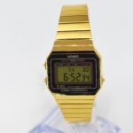 This edition to the Casio Vintage range adds a luxe modern touch to your wristwear. A resin rectangular case presents the digital display, with a choice of 12/24 hour timekeeping, stopwatch function with a 1/100 second accuracy, automatic calendar with day, date & month and an LED light for easy readability in all light conditions. Finished with a gold tone stainless steel bracelet, complete with an adjustable fastening for a secure and classic feel. This watch has all the key retro features, therefore perfect for Casio fans.