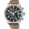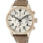 This Citizen watch has a gold coated stainless steel case 43mm in diameter and is fitted with a leather strap. Inside the case lies a quartz chronograph movement and the watch features a mineral crystal.