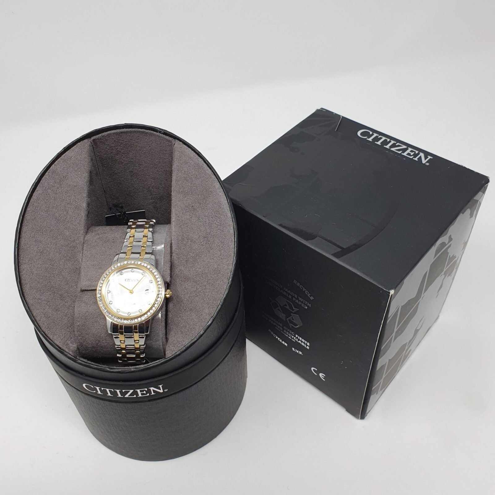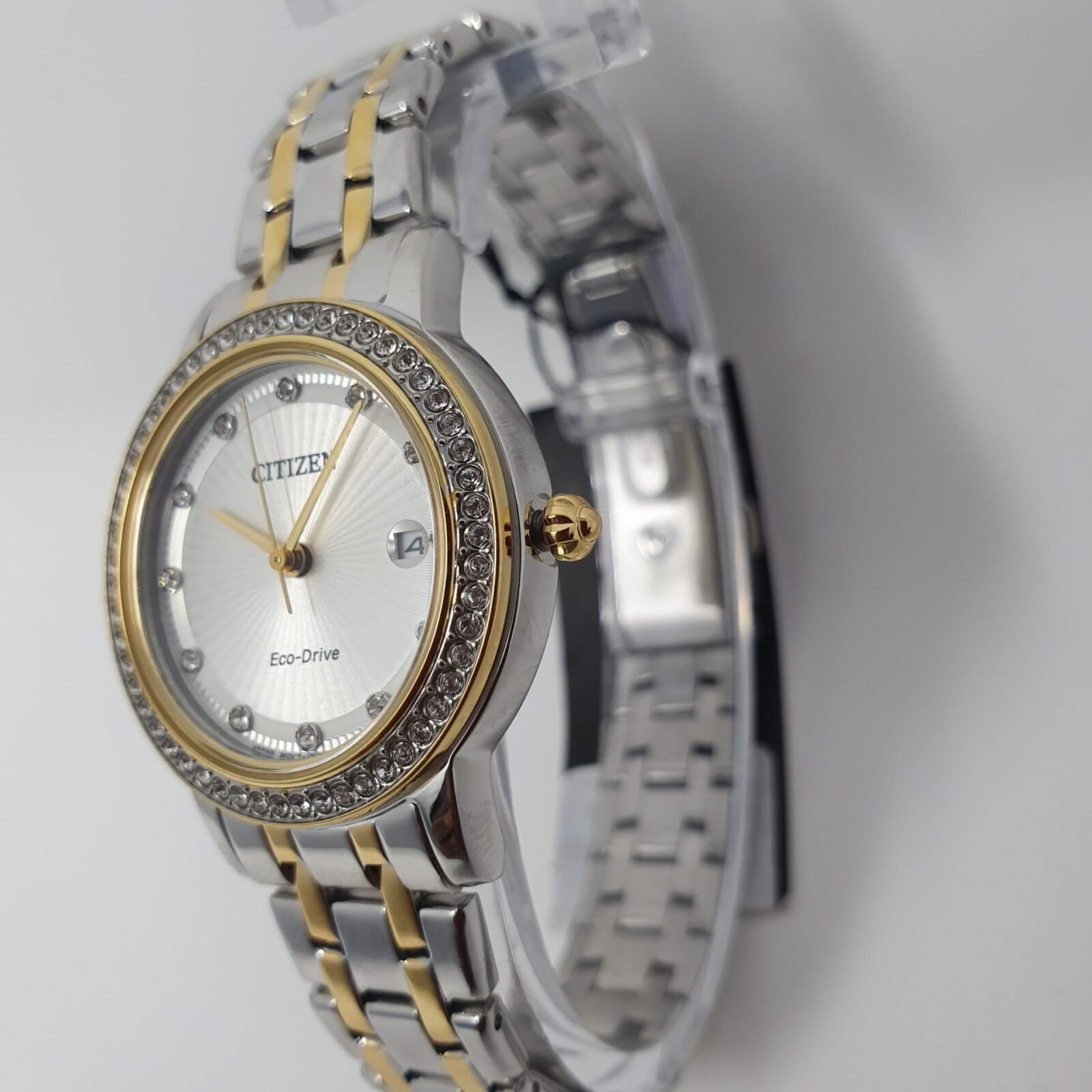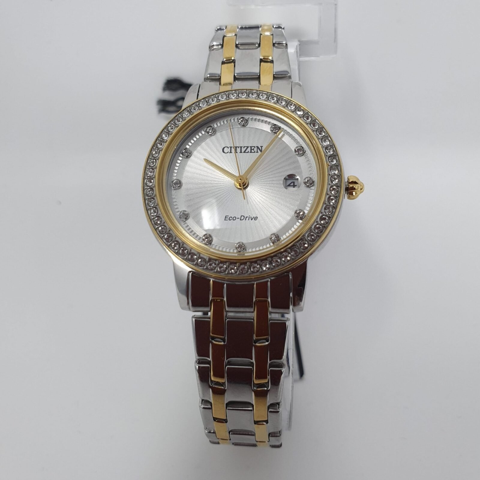 This ladies two-tone Eco-Drive 2/3 hands and a date watch by Citizen has a stainless steel case and two-tone bracelet, featuring a Swarovski crystal bezel. It is 50m water resistant and comes with a 5 year guarantee.