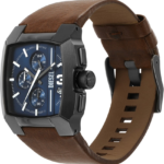 The Diesel DZ4641 Cliffhanger watch boasts a striking blue dial accentuated by durable gunmetal hands, ensuring readability while maintaining an elegant look. The gunmetal stainless steel case perfectly complements the brown leather band, creating a sophisticated appearance suitable for both casual and formal settings.