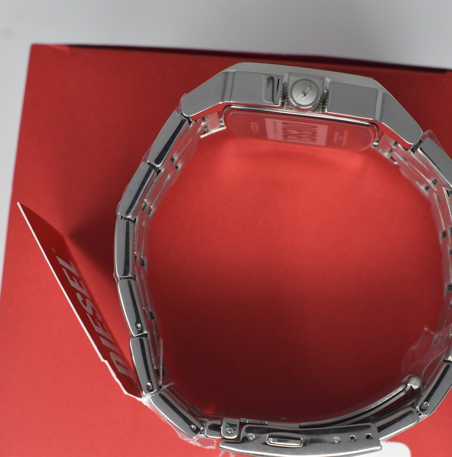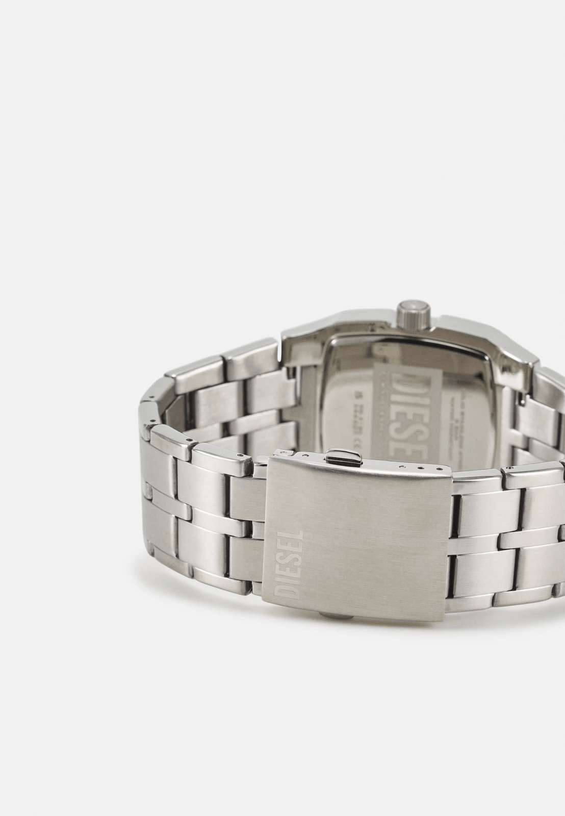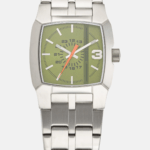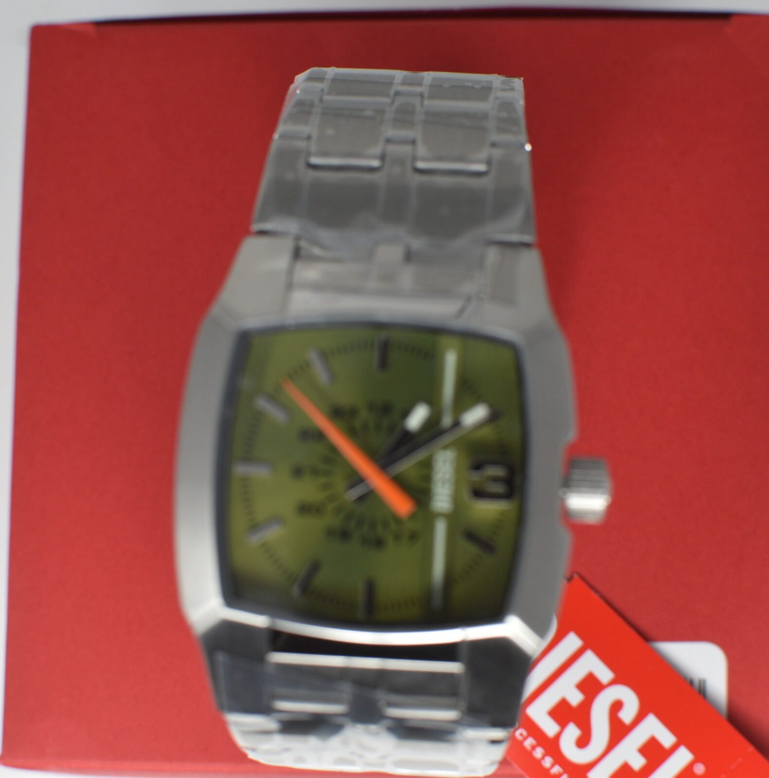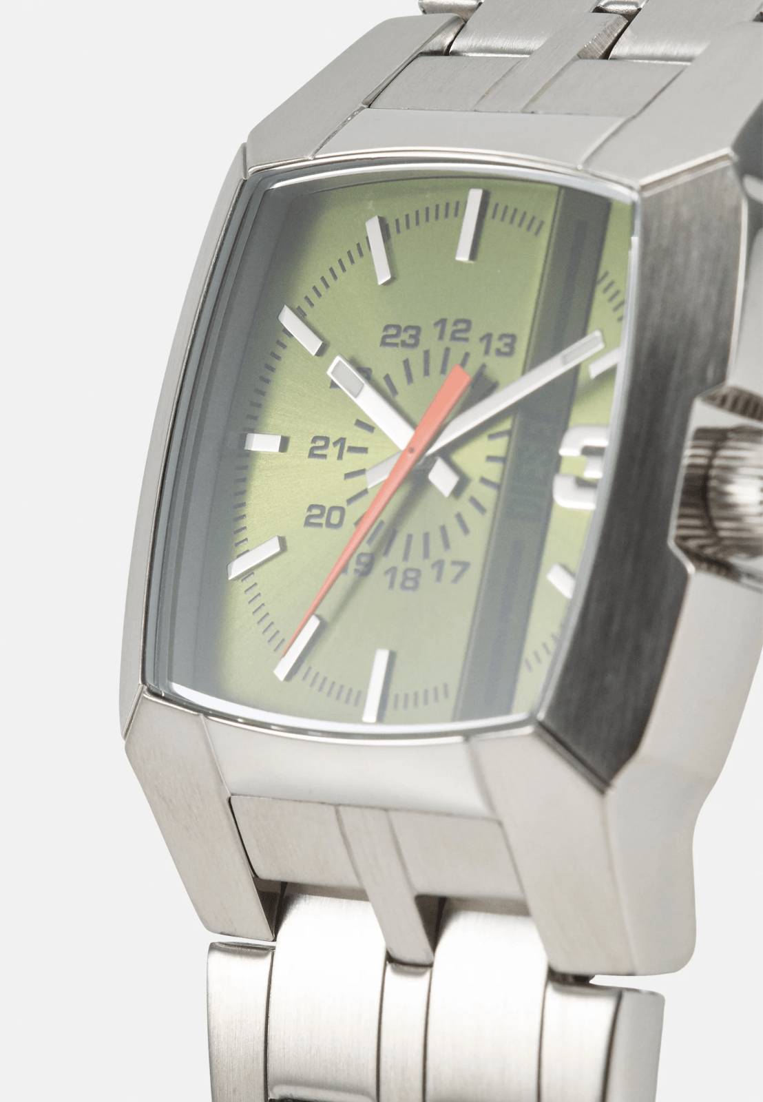 Diesel’s 36mm Cliffhanger watch features a green sunray dial, three-hand movement and stainless steel bracelet.